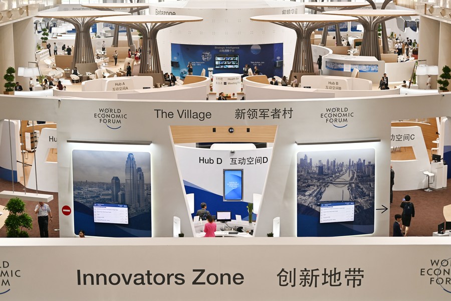 This photo taken on June 27, 2023 shows a view of the venue for the 14th Annual Meeting of the New Champions, also known as the Summer Davos, in north China's Tianjin Municipality. (Xinhua/Li Ran)