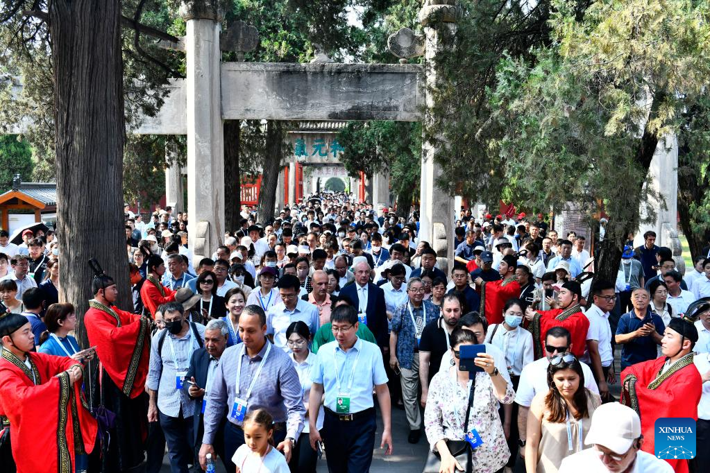 Guests and tourists visit the Confucius Temple in Qufu, east China's Shandong Province, June 27, 2023. A series of activities to promote traditional Chinese culture were held at the Confucius Temple in Qufu during the World Internet Conference Nishan Dialogue on Digital Civilization on Tuesday. (Xinhua/Guo Xulei)