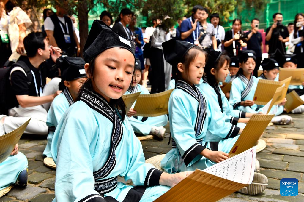 Children read the Analects of Confucius at the Confucius Temple in Qufu, east China's Shandong Province, June 27, 2023. A series of activities to promote traditional Chinese culture were held at the Confucius Temple in Qufu during the World Internet Conference Nishan Dialogue on Digital Civilization on Tuesday. (Xinhua/Guo Xulei)