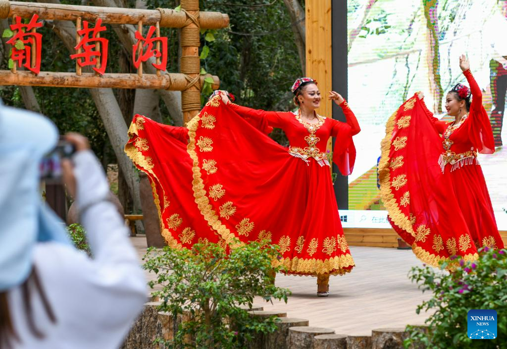 A performance is staged at the Grape Valley scenic area in Turpan, northwest China's Xinjiang Uygur Autonomous Region, June 26, 2023.