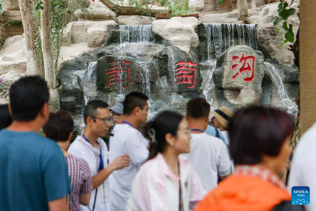 Tourists visit the Grape Valley scenic area in Turpan, northwest China's Xinjiang Uygur Autonomous Region, June 26, 2023.