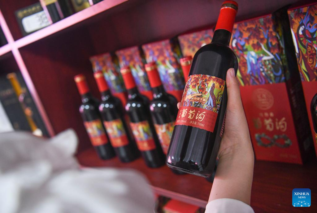 A tourist selects wine products at the Grape Valley scenic area in Turpan, northwest China's Xinjiang Uygur Autonomous Region, June 26, 2023.