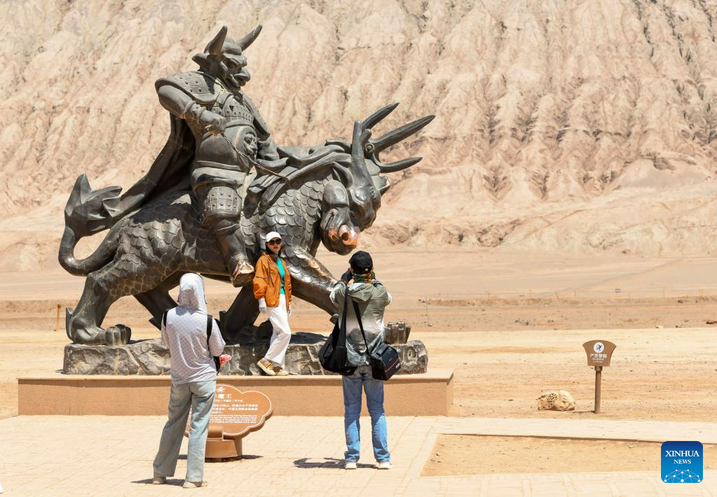 Tourists visit the Flaming Mountain scenic area in Turpan, northwest China's Xinjiang Uygur Autonomous Region, June 27, 2023.