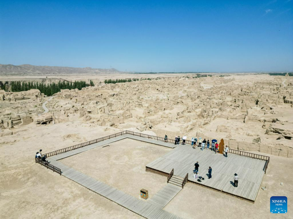 In this aerial photo, tourists visit the Jiaohe Ruins, a world cultural heritage site, in Turpan, northwest China's Xinjiang Uygur Autonomous Region, June 25, 2023.