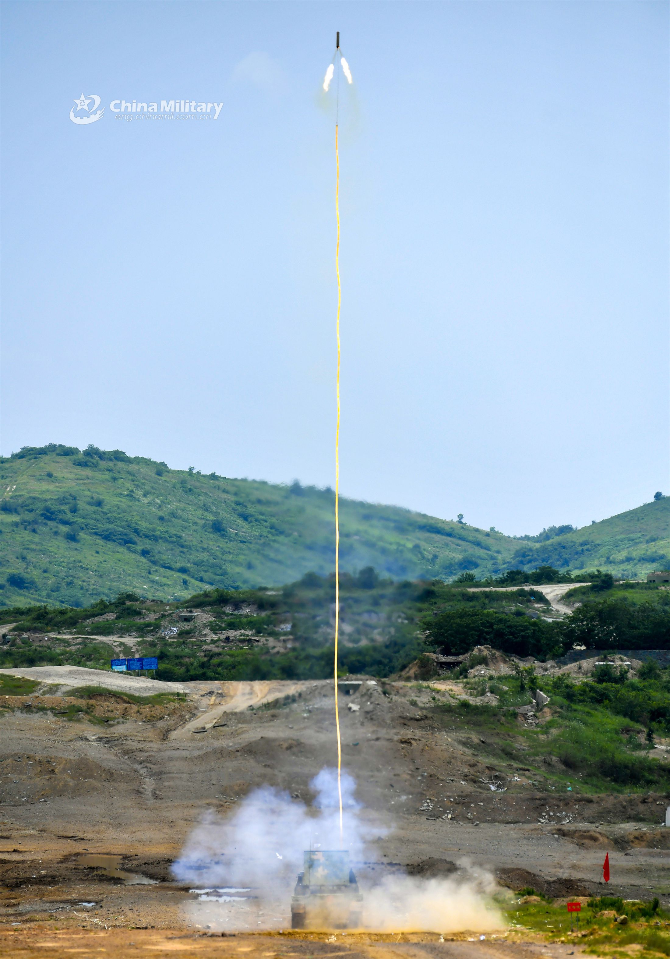 Mine-clearing vehicle attached to a combined-arms brigade under the PLA 71st Group Army launches a rocket-projected mine clearing line charge (MICLIC) to blow up mine threats during explosive ordnance disposal training on June 18, 2023. (eng.chinamil.com.cn/Photo by Yao Zongkai)