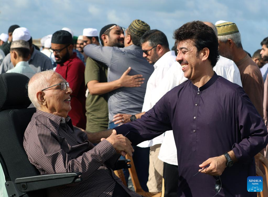 People greet each other after the Eid al-Adha prayer at Galle Face Green in Colombo, Sri Lanka, on June 29, 2023. (Photo by Ajith Perera/Xinhua)