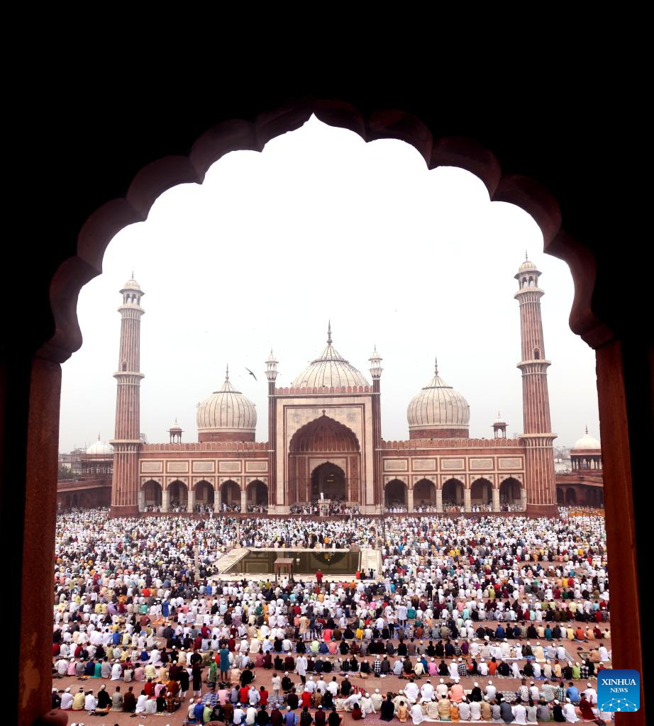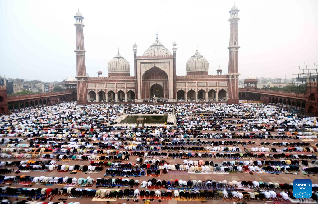 People offer Eid Al-Adha prayers at a grand mosque in New Delhi, India, June 29, 2023. (Str/Xinhua)