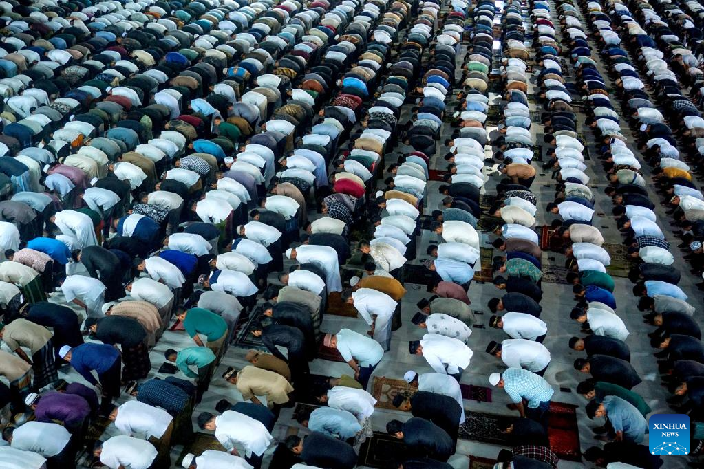 People attend the Eid al-Adha prayer at a mosque in Lhokseumawe, Aceh Province, Indonesia, on June 29, 2023. (Photo by Fachrul Reza/Xinhua)