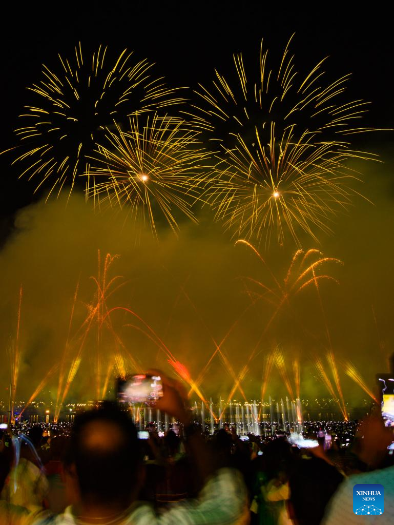 Fireworks light up the sky over Lusail Boulevard during celebrations of the Eid al-Adha festival in Lusail, Qatar, June 28, 2023. (Photo by Nikku/Xinhua)