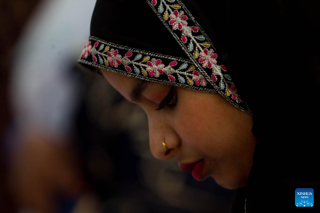 A woman prays during the Muslim festival of Eid al-Adha, or the Feast of Sacrifice, in Kathmandu, Nepal, June 29, 2023. (Photo by Sulav Shrestha/Xinhua)