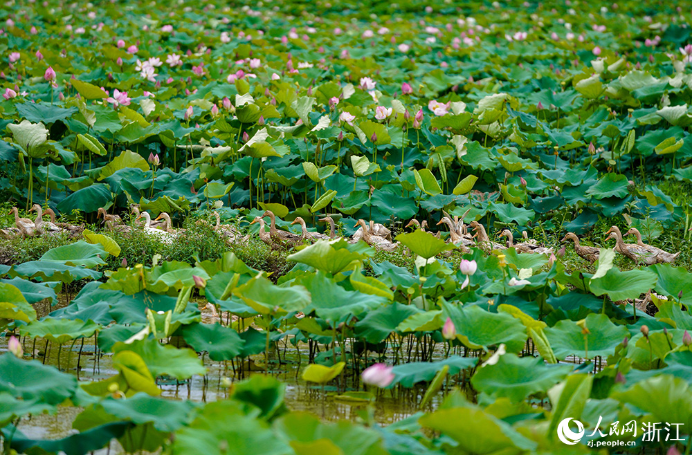 Ducks are seen in a lotus pond in Laozhu She township in Liandu district, Lishui city, east China's Zhejiang Province. (People's Daily Online/Zhang Yongtao)