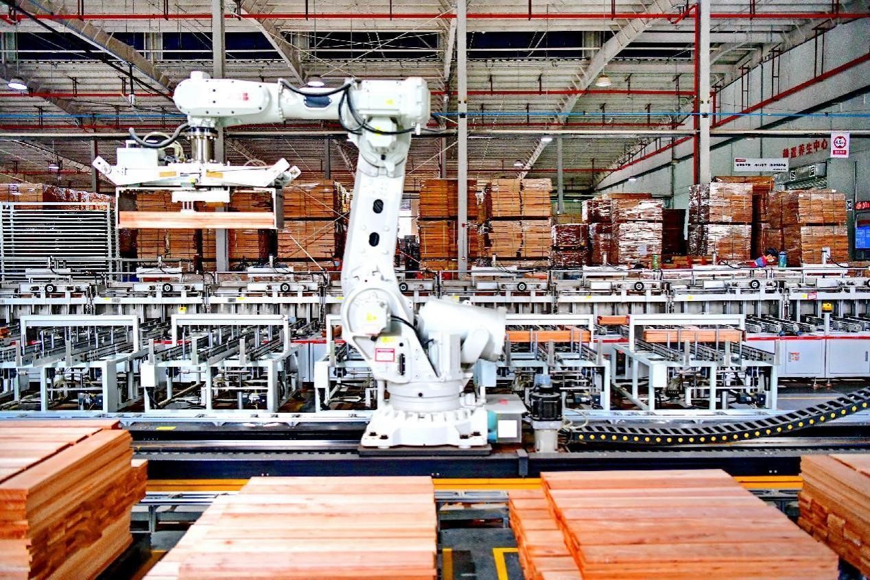 Wood floors are manufactured by a robotic arm in an intelligent workshop of an enterprise in Ganzhou, east China's Jiangxi province. (People's Daily Online/Zhu Haipeng)