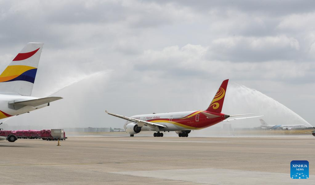Hainan airlines HU760 flight receives a water salute before taking off for Shenzhen at Brussels Airport in Zaventem, Belgium, June 28, 2023. A ceremony was held for China's Hainan airlines at Brussels Airport on Wednesday to mark the resumption of its Brussels-Shenzhen direct flights. (Xinhua/Zheng Huansong)