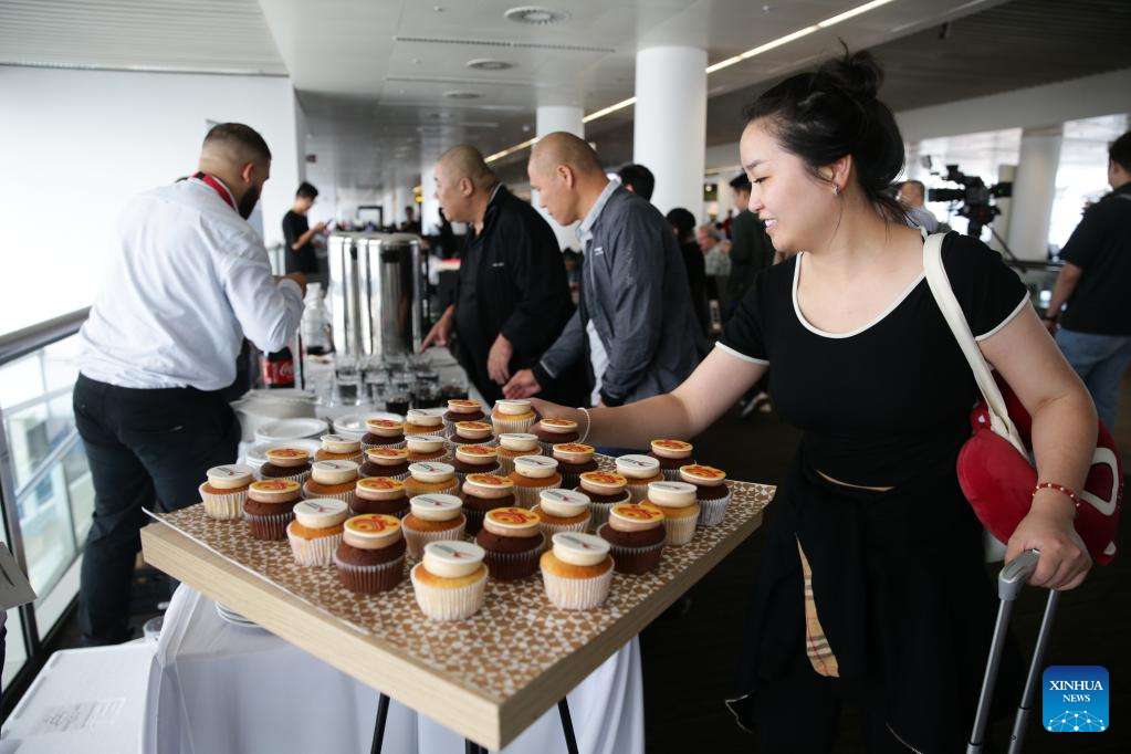 A passenger takes a cupcake at the Brussels Airport in Zaventem, Belgium, June 28, 2023. A ceremony was held for China's Hainan airlines at Brussels Airport on Wednesday to mark the resumption of its Brussels-Shenzhen direct flights. (Xinhua/Zheng Huansong)