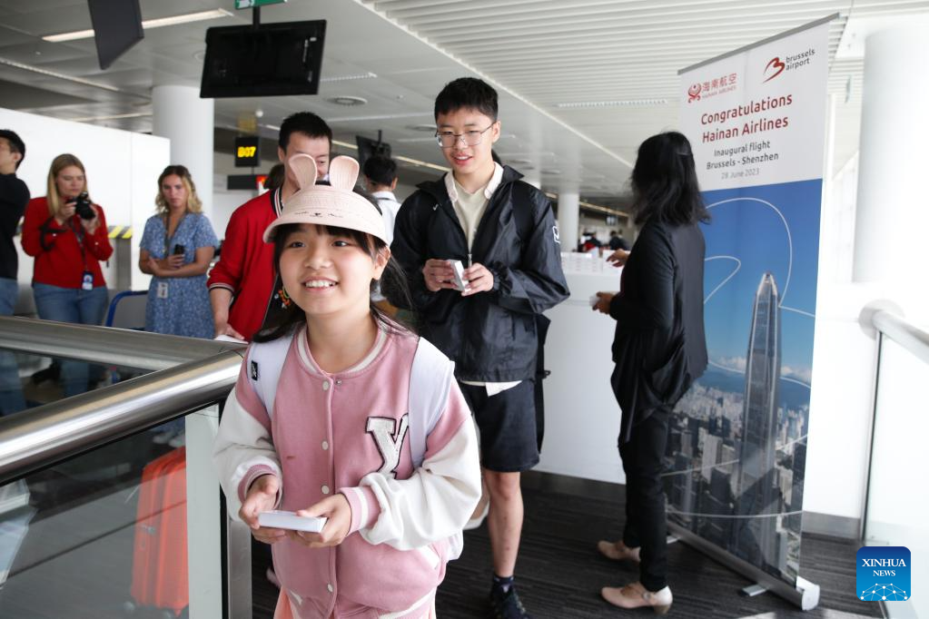 Passengers heading for Shenzhen start boarding at Brussels Airport in Zaventem, Belgium, June 28, 2023. A ceremony was held for China's Hainan airlines at Brussels Airport on Wednesday to mark the resumption of its Brussels-Shenzhen direct flights. (Xinhua/Zheng Huansong)