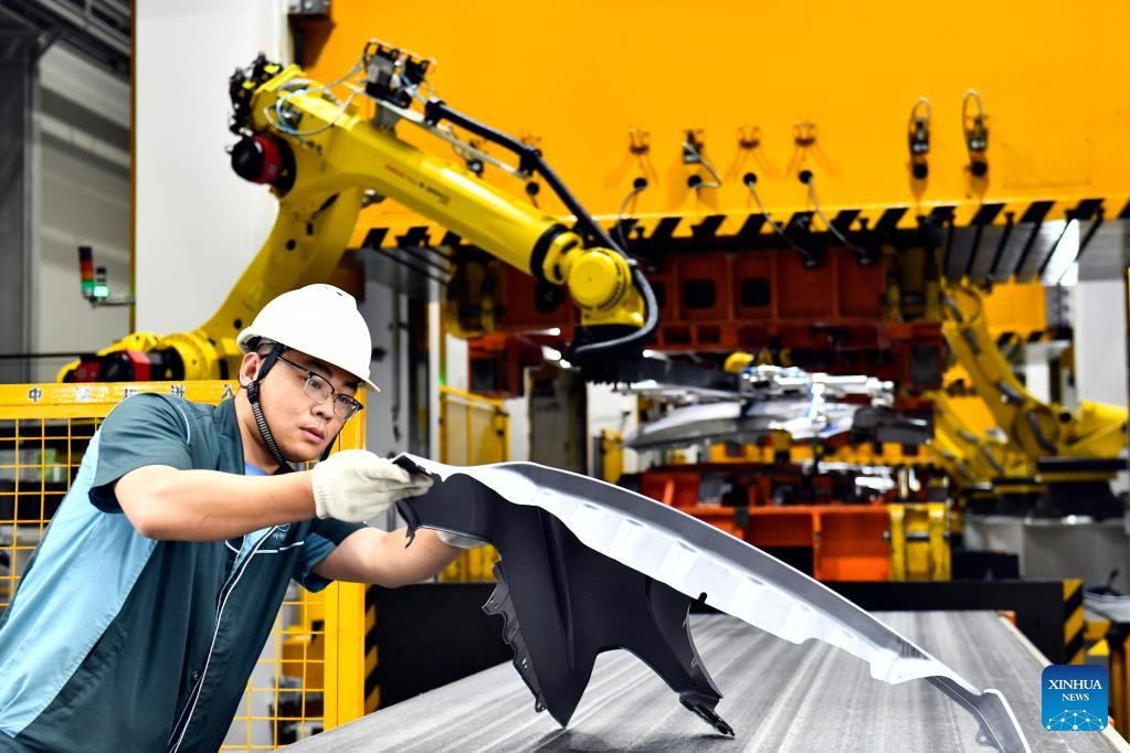 A staff member checks an auto part at carmaker ZXAUTO in Rizhao Hi-Tech Industrial Development Zone of Rizhao City, east China's Shandong Province, June 29, 2023. (Xinhua/Guo Xulei)