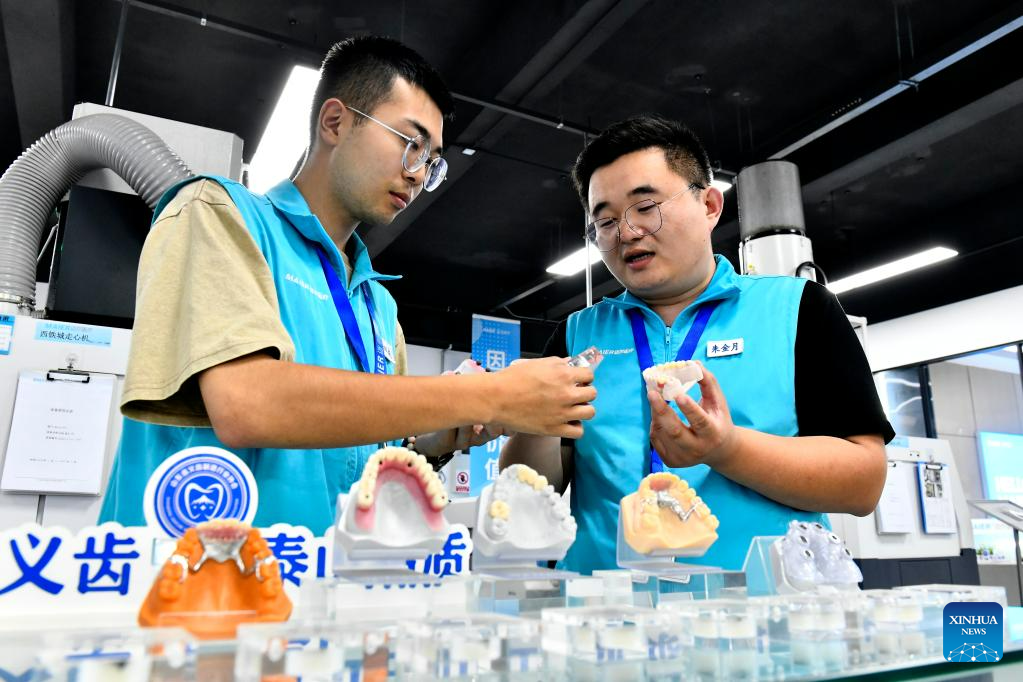 A staff member operates a machine to make dentures at an industrial park in Rizhao Hi-Tech Industrial Development Zone of Rizhao City, east China's Shandong Province, June 29, 2023. (Xinhua/Guo Xulei)