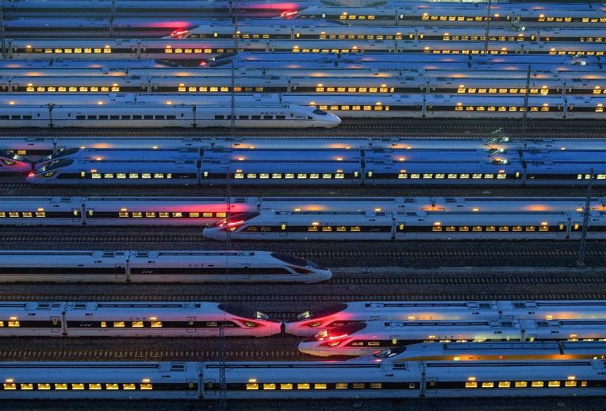 Photo taken on June 20, 2023 shows high-speed trains in Nanjing, east China's Jiangsu province. (Photo by Fang Dongxu/People's Daily Online)