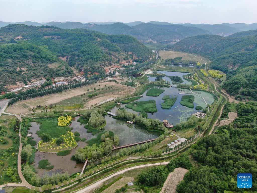 This aerial photo taken on June 26, 2023 shows the Nanniwan National Wetland Park in Yan'an City, northwest China's Shaanxi Province. The towering Baota Mountain and rolling Yanhe River have witnessed the development of Yan'an, an old revolutionary base on the Loess Plateau of northwest China. These photos present the new cityscape of Yan'an in the occasion of the 102nd anniversary of the founding of the Communist Party of China (CPC). (Xinhua/Zhang Bowen)