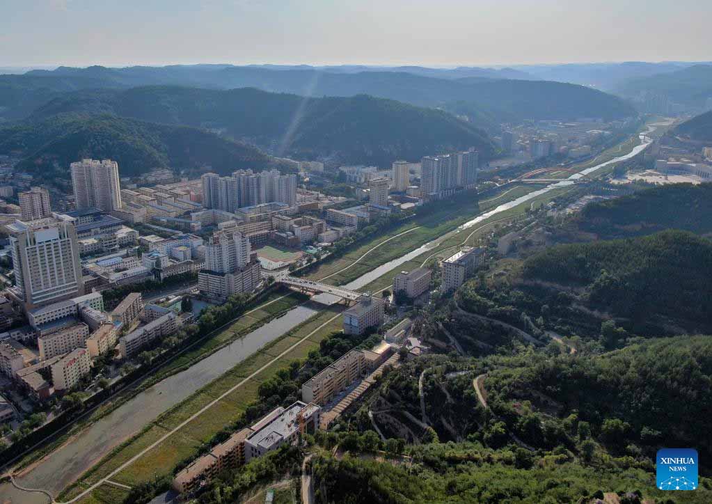 This aerial photo taken on June 26, 2023 shows a view of Yan'an City, northwest China's Shaanxi Province. The towering Baota Mountain and rolling Yanhe River have witnessed the development of Yan'an, an old revolutionary base on the Loess Plateau of northwest China. These photos present the new cityscape of Yan'an in the occasion of the 102nd anniversary of the founding of the Communist Party of China (CPC). (Xinhua/Zhang Bowen)