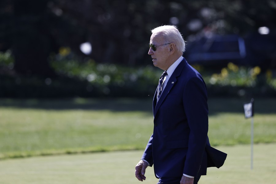 U.S. President Joe Biden walks on the South Lawn to board Marine One at the White House in Washington, D.C., the United States, March 9, 2023.(Photo by Ting Shen/Xinhua)