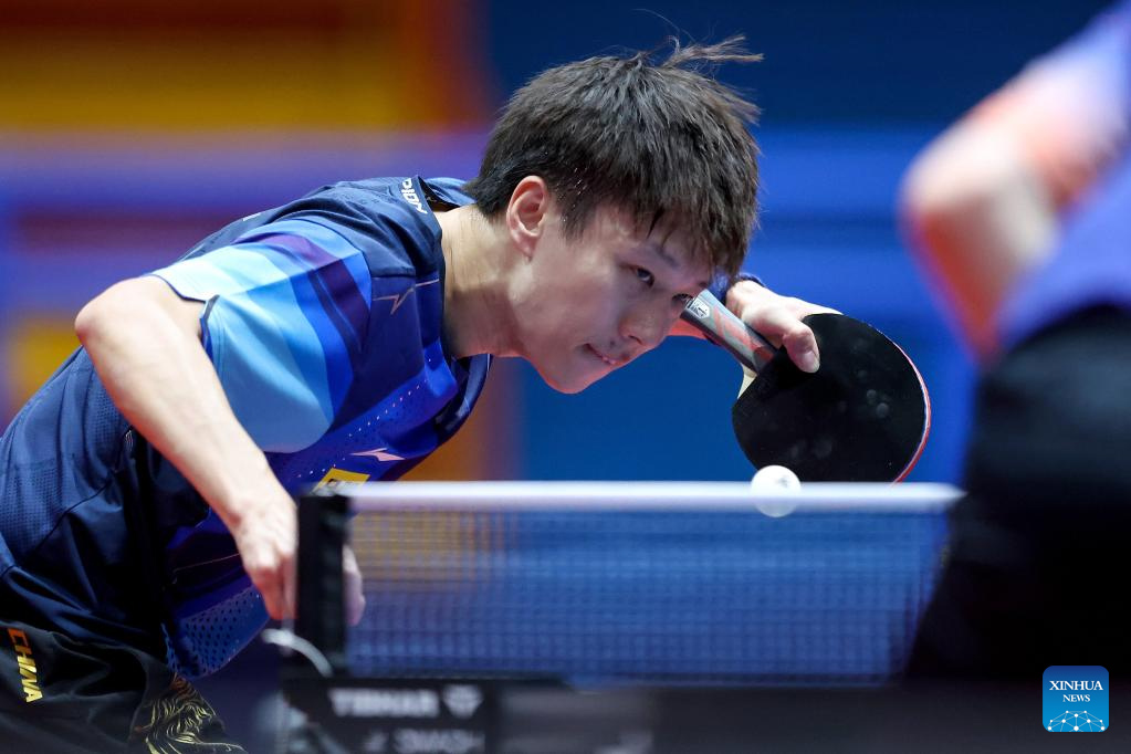 Fan Zhendong of China competes during the men's singles round of 16 match against Oh Junsung of South Korea at the 2023 World Table Tennis (WTT) Contender Zagreb in Zagreb, Croatia on June 30, 2023. (Photo by Igor Kralj/PIXSELL via Xinhua)