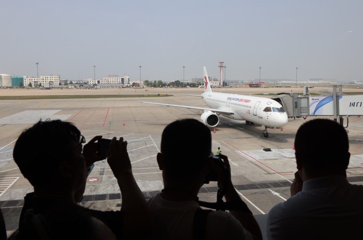 Passengers at an airport take pictures of China Eastern Airlines' C919 aircraft in Beijing on May 28. TAO RAN/FOR CHINA DAILY