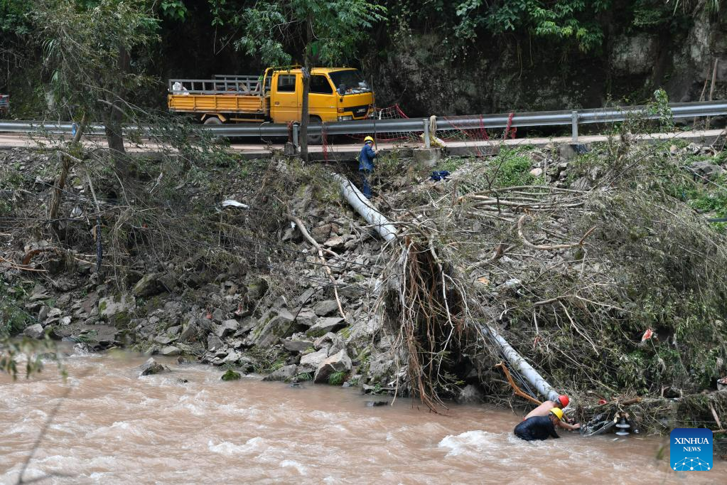 Workers repair power facilities in Caotan Village of Yantouzhai Town, Guzhang County of Xiangxi Tujia and Miao Autonomous Prefecture, central China's Hunan Province, July 2, 2023.?With the flood gradually receding, the cadres and masses in the affected areas are working hard to ensure the basic needs of the affected people. (Xinhua/Chen Zhenhai)