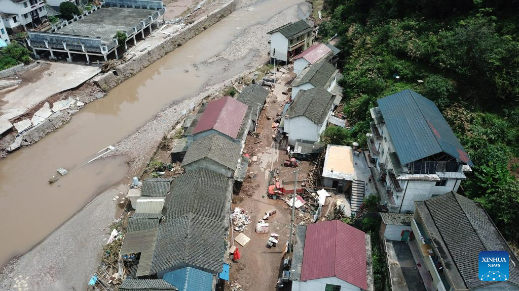 This aerial photo taken on July 2, 2023 shows a view of the residential area in Caotan Village of Yantouzhai Town, Guzhang County of Xiangxi Tujia and Miao Autonomous Prefecture, central China's Hunan Province.?With the flood gradually receding, the cadres and masses in the affected areas are working hard to ensure the basic needs of the affected people. (Xinhua/Chen Zhenhai)