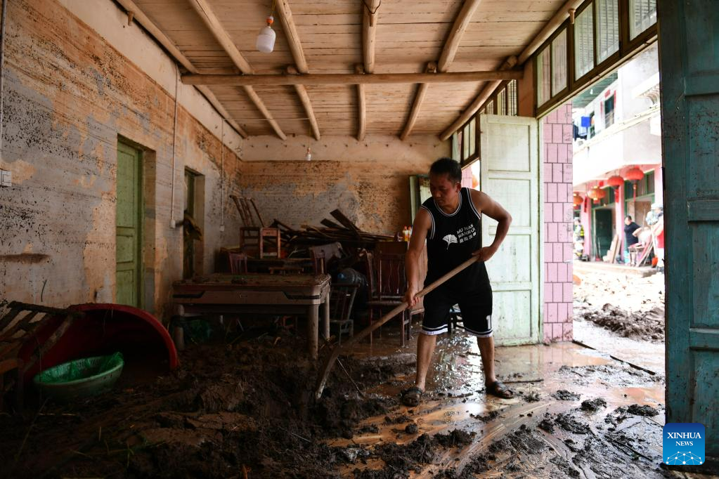 A villager clears the mud in his house in Caotan Village of Yantouzhai Town, Guzhang County of Xiangxi Tujia and Miao Autonomous Prefecture, central China's Hunan Province, July 2, 2023.?With the flood gradually receding, the cadres and masses in the affected areas are working hard to ensure the basic needs of the affected people. (Xinhua/Chen Zhenhai)