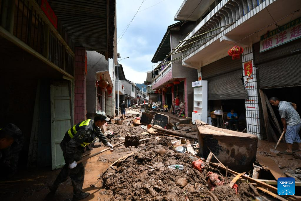 Local people clean up silt and garbage in Caotan Village of Yantouzhai Town, Guzhang County of Xiangxi Tujia and Miao Autonomous Prefecture, central China's Hunan Province, July 2, 2023.?With the flood gradually receding, the cadres and masses in the affected areas are working hard to ensure the basic needs of the affected people. (Xinhua/Chen Zhenhai)