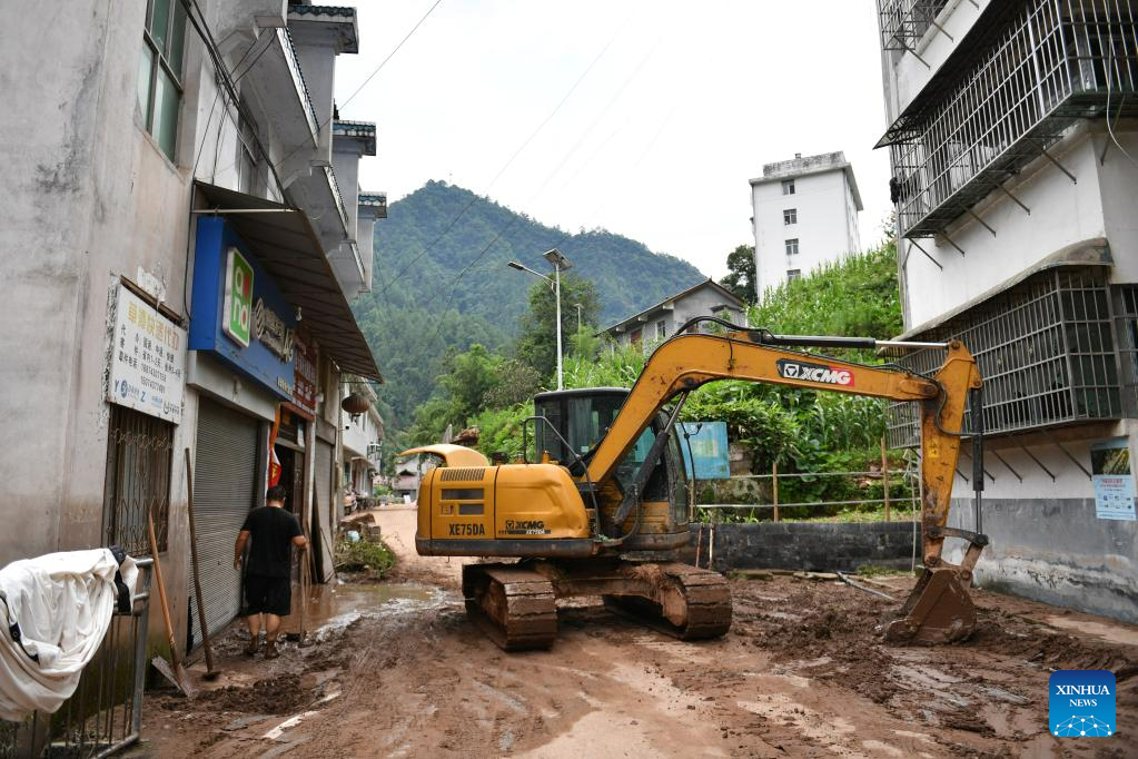 A villager operates an excavator to clean up silt in Caotan Village of Yantouzhai Town, Guzhang County of Xiangxi Tujia and Miao Autonomous Prefecture, central China's Hunan Province, July 2, 2023.?With the flood gradually receding, the cadres and masses in the affected areas are working hard to ensure the basic needs of the affected people. (Xinhua/Chen Zhenhai)