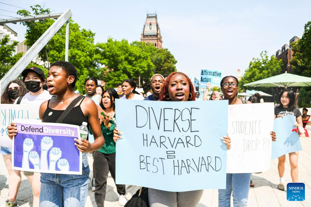 Participants march and chant slogans at a rally protesting the Supreme Court's ruling against affirmative action on Harvard University Campus in Cambridge, Massachusetts, the United States, on July 1, 2023. (Photo by Ziyu Julian Zhu/Xinhua)