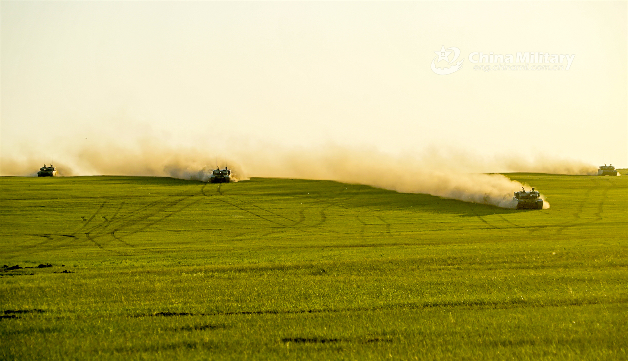 Main battle tanks (MBTs) attached to a brigade under the PLA 82nd Group Army move forward under the sunset during a maneuvering training exercise in the Gobi desert in late June, 2023. (eng.chinamil.com.cn/Photo by Sun Tongkai)