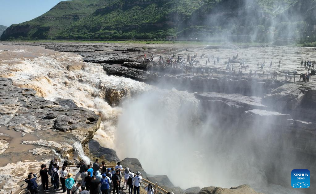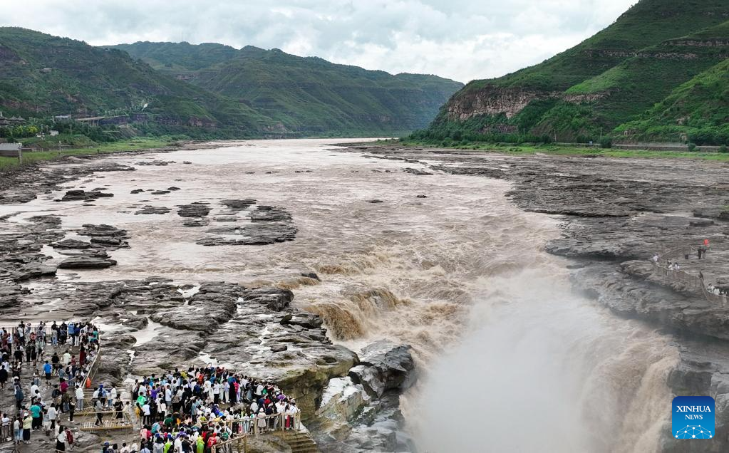 This aerial photo taken on July 3, 2023 shows tourists viewing the scenery of the Hukou Waterfall on the Yellow River, on the border area between north China's Shanxi and northwest China's Shaanxi provinces. (Photo by Zhang Lan/Xinhua)