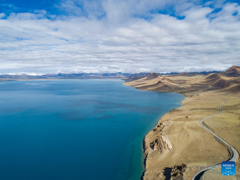 This aerial photo taken on July 4, 2023 shows a view of the Puma Yumco Lake in Nagarze County of Shannan, southwest China's Tibet Autonomous Region. (Xinhua/Sun Fei)