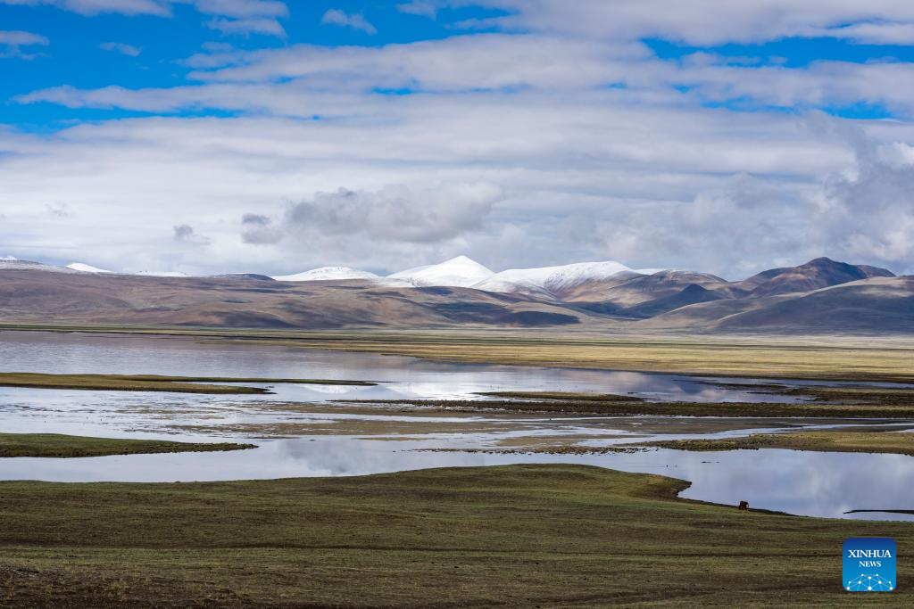 This photo taken on July 4, 2023 shows a view of the wetland by the Puma Yumco Lake in Nagarze County of Shannan, southwest China's Tibet Autonomous Region. (Xinhua/Chen Shangcai)
