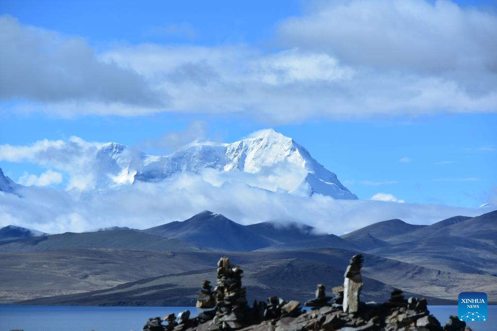 This photo taken on July 4, 2023 shows a snow mountain near the Puma Yumco Lake in Nagarze County of Shannan, southwest China's Tibet Autonomous Region. (Xinhua/Liu Wenbo)