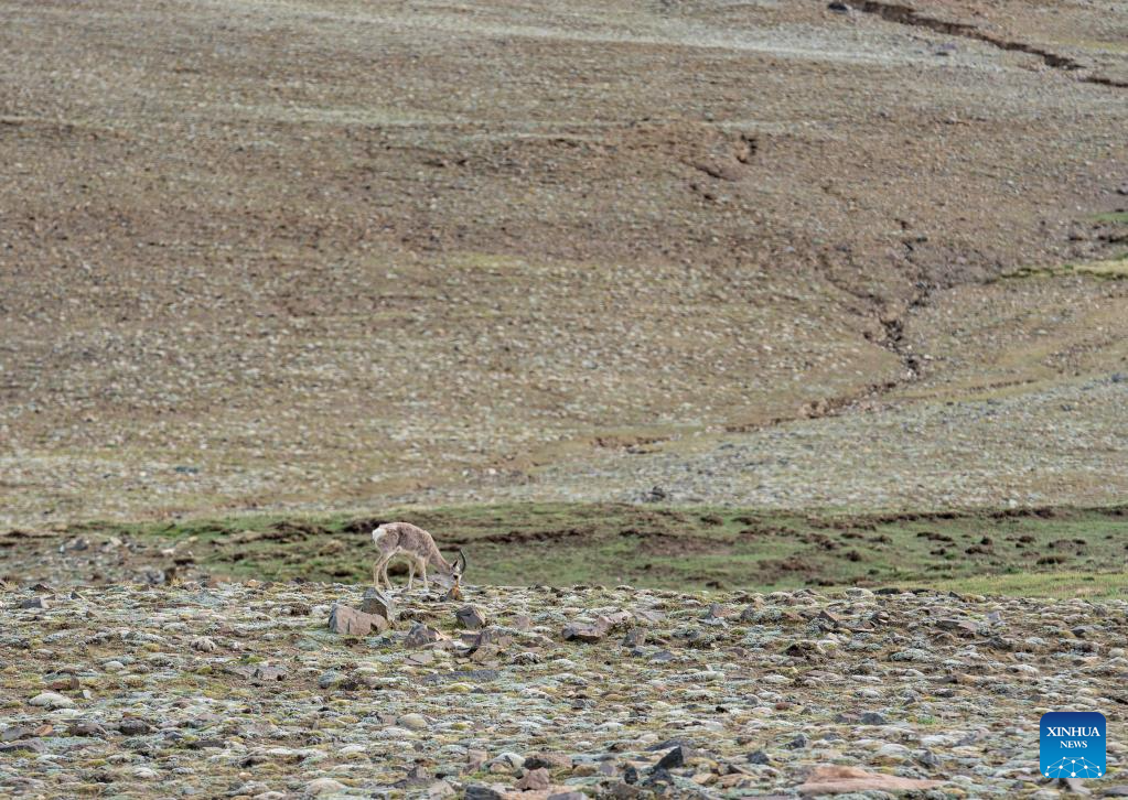 This photo taken on July 4, 2023 shows a Tibetan gazelle near the Puma Yumco Lake in Nagarze County of Shannan, southwest China's Tibet Autonomous Region. (Xinhua/Sun Fei)