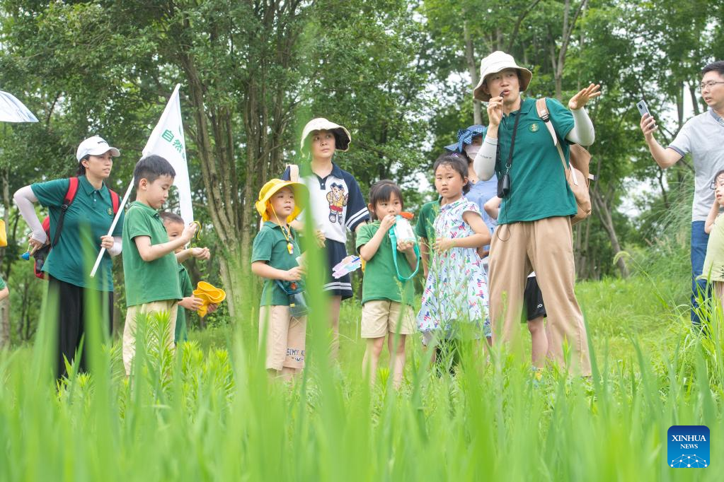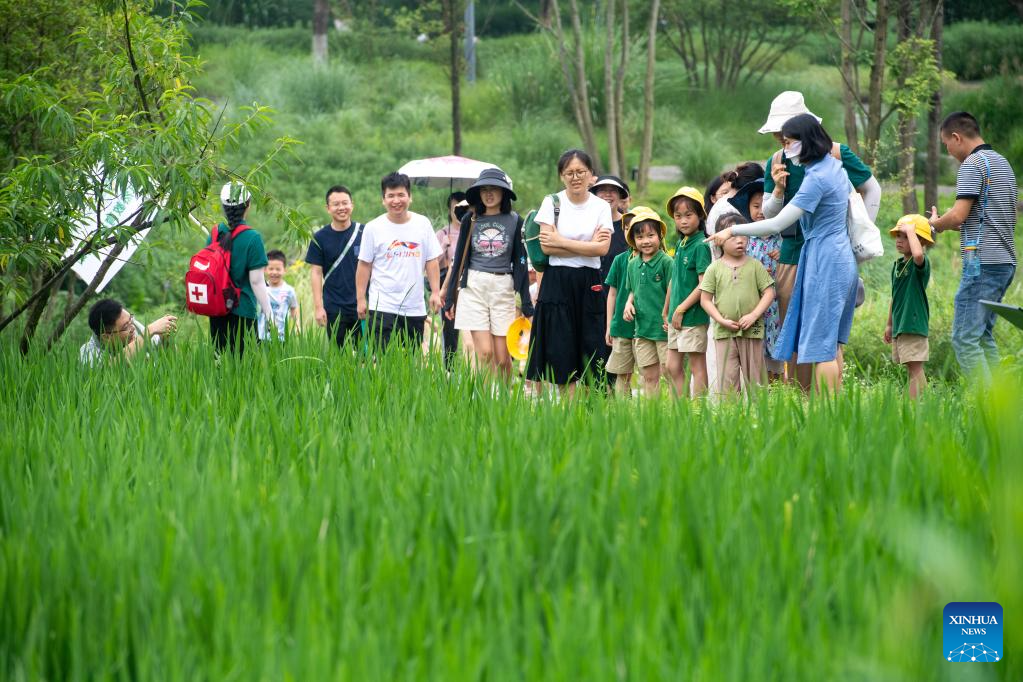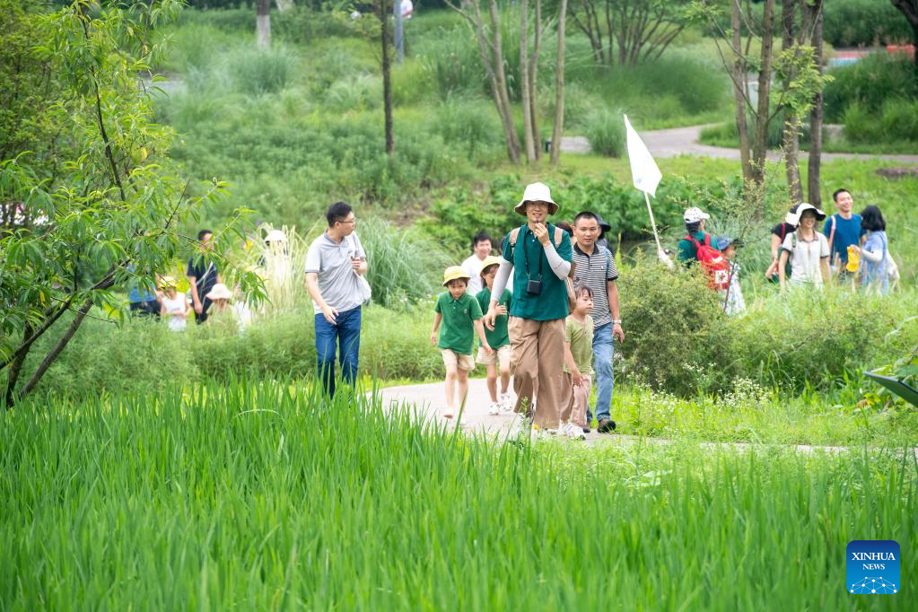 Parents and children visit Guangyang Isle for an ecological education tour in southwest China's Chongqing, July 3, 2023. (Xinhua/Tang Yi)