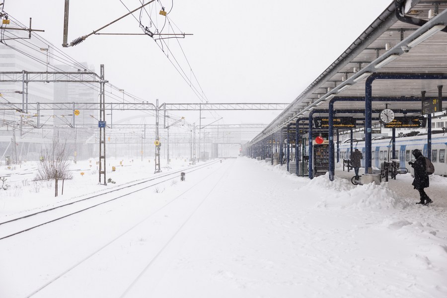 This photo taken on March 8, 2023 shows a snow-covered commuter train station in Stockholm, Sweden. (Photo by Wei Xuechao/Xinhua)