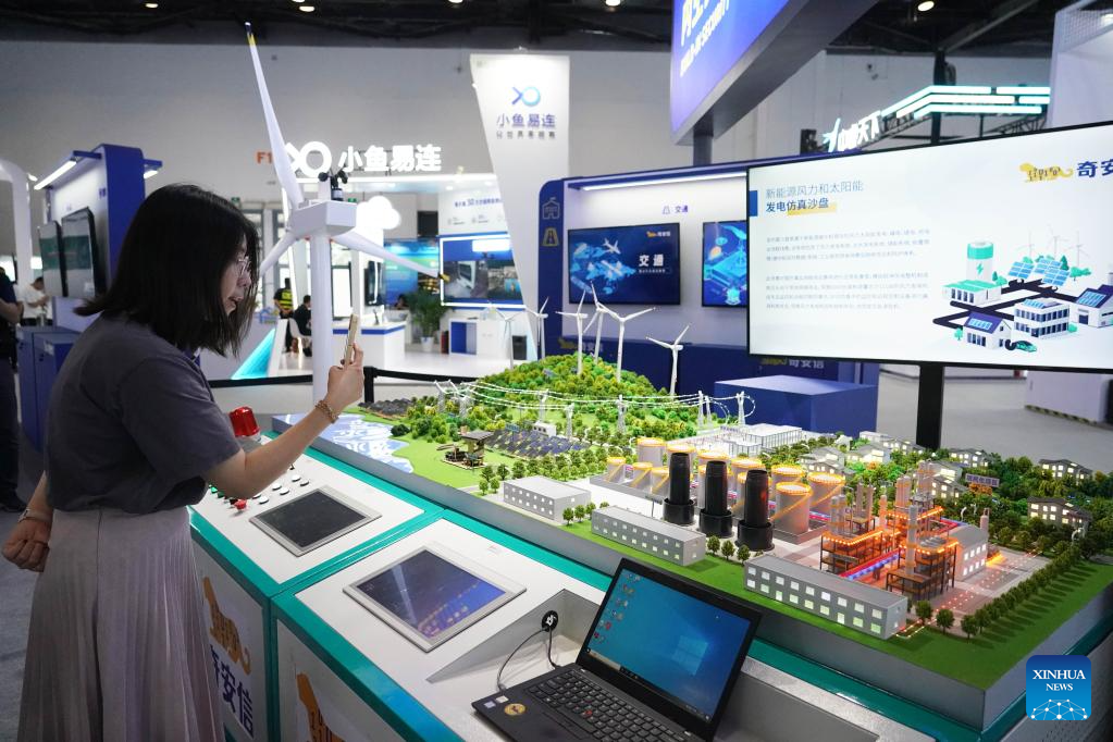 This photo taken on July 4, 2023 shows a model of new energy power generation at an exhibition during the Global Digital Economy Conference 2023 at the China National Convention Center in Beijing, capital of China. The Global Digital Economy Conference 2023 is scheduled from July 4 to 7 in Beijing. (Xinhua/Ren Chao)
