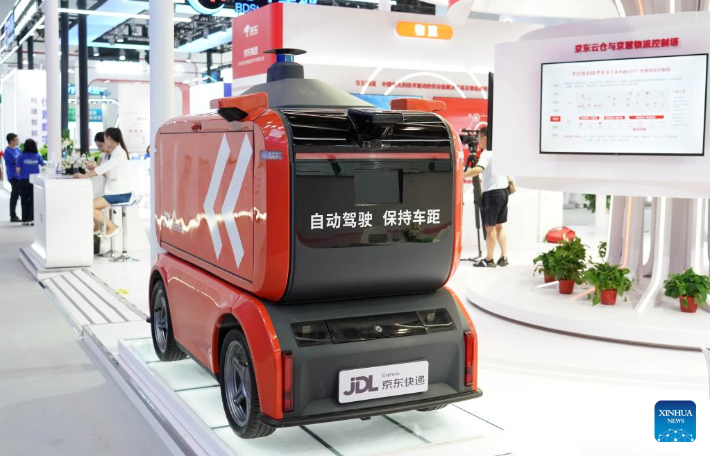 This photo taken on July 4, 2023 shows an automatic delivery vehicle at an exhibition during the Global Digital Economy Conference 2023 at the China National Convention Center in Beijing, capital of China. The Global Digital Economy Conference 2023 is scheduled from July 4 to 7 in Beijing. (Xinhua/Ren Chao)