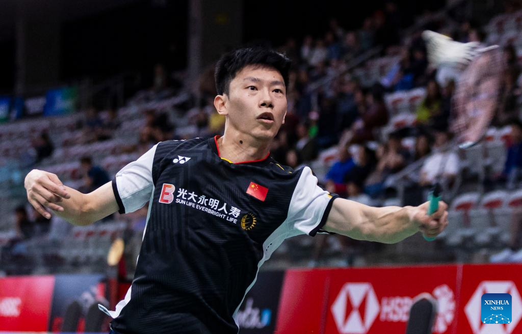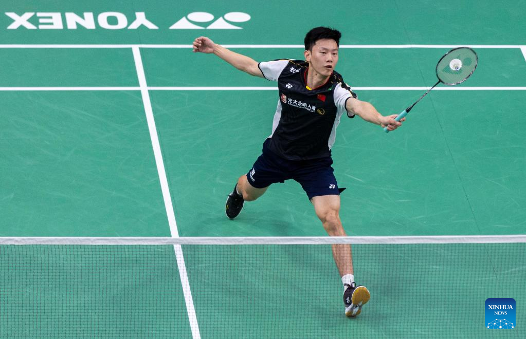 Lei Lanxi of China returns a shot during the second round of men's singles qualification match against Kashyap Parupalli of India at the 2023 Canada Open badminton tournament in Calgary, Canada, on July 4, 2023. (Photo by Zou Zheng/Xinhua)