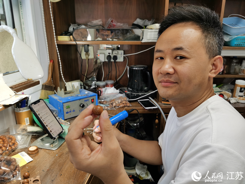 A fruit pit carving artist showcases a fruit pit carving work. (People's Daily Online/Wang Jiliang)