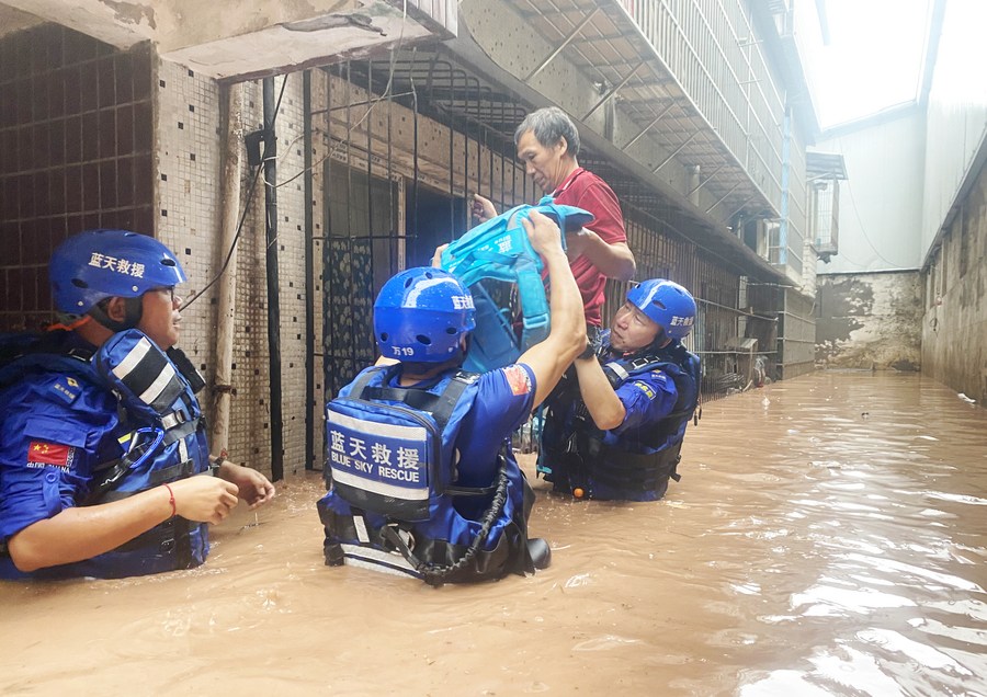Members from the Blue Sky Rescue Team, a Chinese civil relief squad, transfer a flood-trapped resident in Wanzhou District, southwest China's Chongqing, July 4, 2023. (Photo by Feng Tao/Xinhua)
