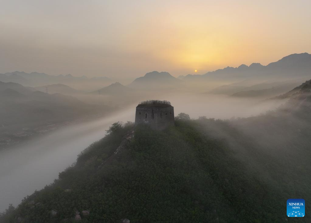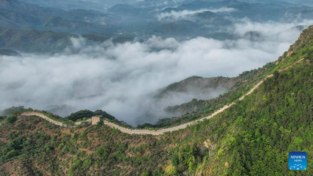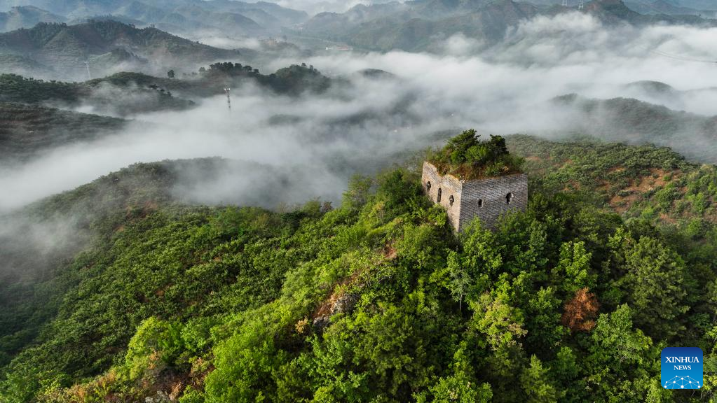 This aerial photo taken on July 5, 2023 shows the Dongjiakou Great Wall shrouded in fog in Qianxi County of Tangshan, north China's Hebei Province. (Photo by Wang Aijun/Xinhua)