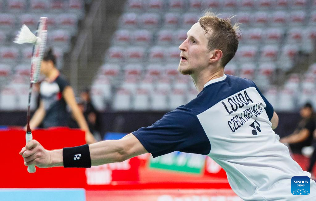 Jan Louda of the Czech Republic returns a shot during the first round of men's singles match against Weng Hongyang of China at the 2023 Canada Open badminton tournament in Calgary, Canada, on July 5, 2023. (Photo by Zou Zheng/Xinhua)