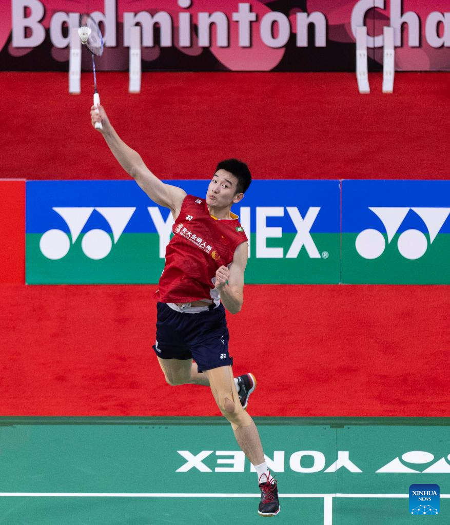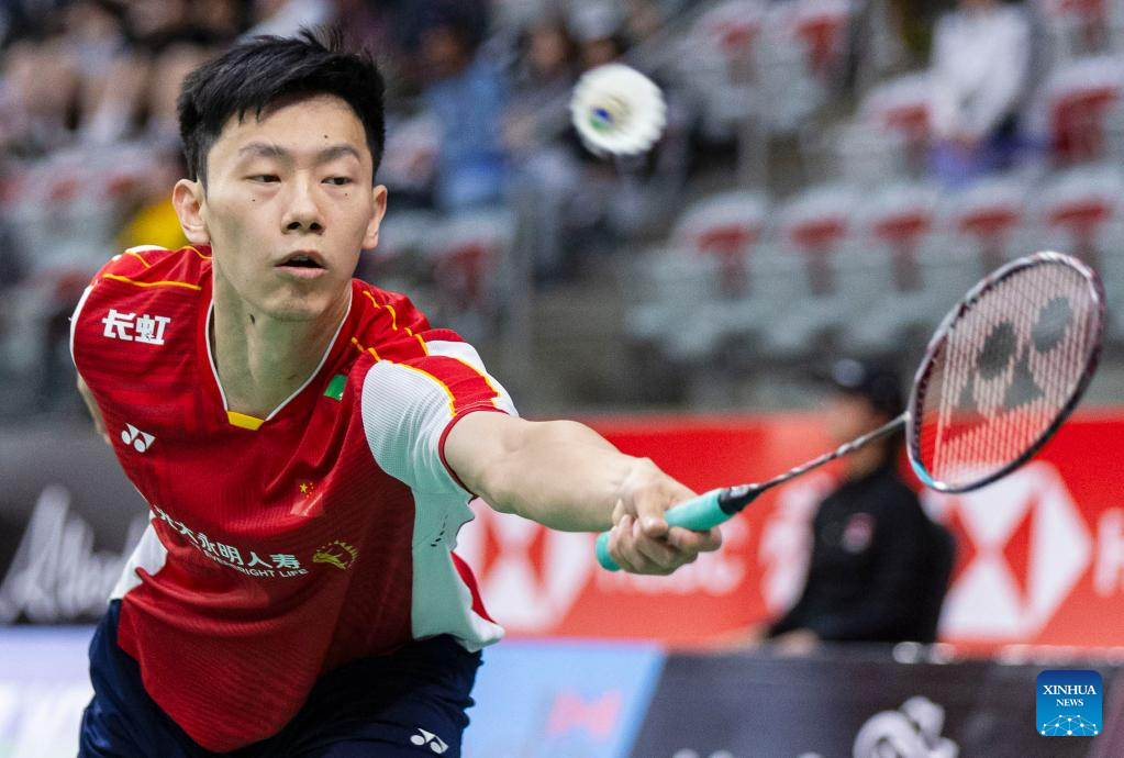 Lei Lanxi of China returns a shot during the first round of men's singles match against Kantaphon Wangcharoen of Thailand at the 2023 Canada Open badminton tournament in Calgary, Canada, on July 5, 2023. (Photo by Zou Zheng/Xinhua)