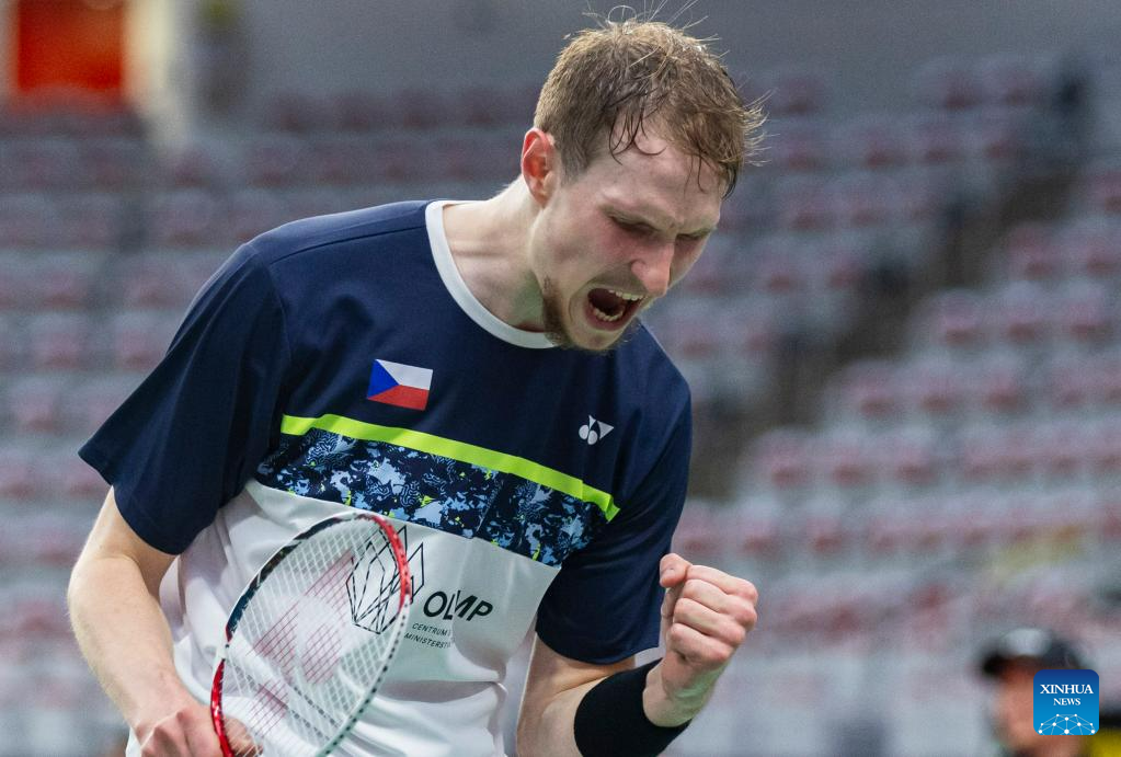Jan Louda of the Czech Republic celebrates victory after the first round of men's singles match against Weng Hongyang of China at the 2023 Canada Open badminton tournament in Calgary, Canada, on July 5, 2023. (Photo by Zou Zheng/Xinhua)